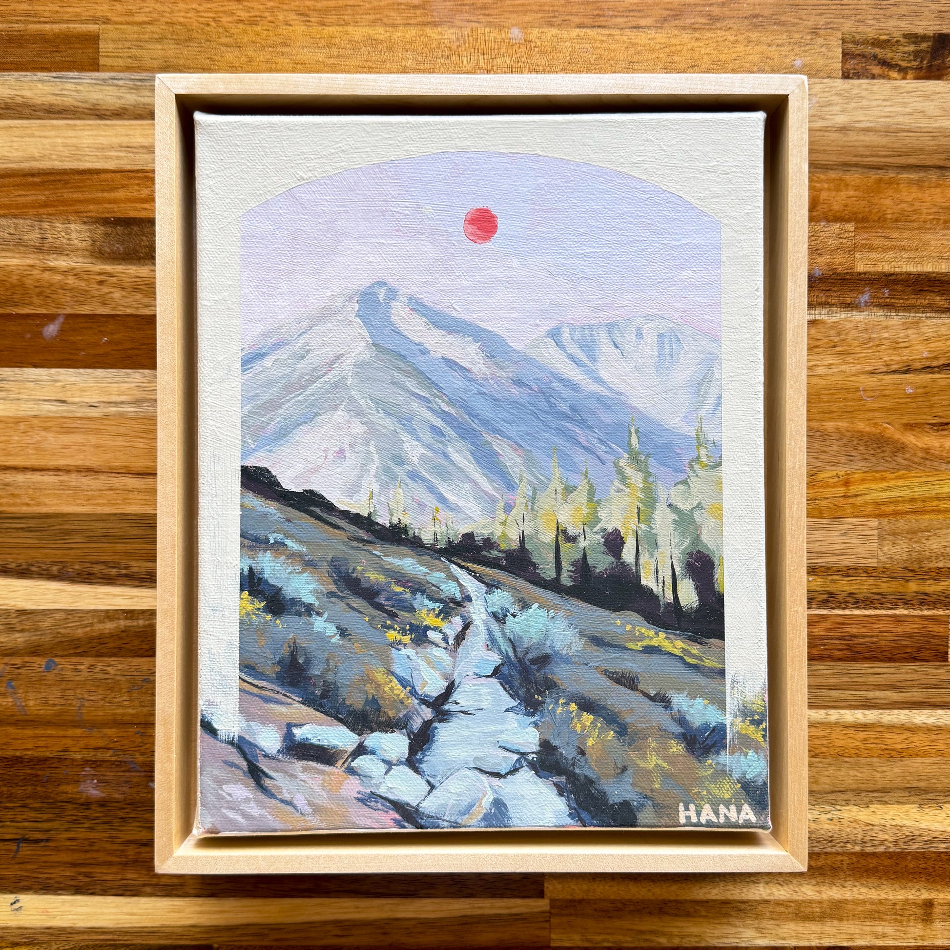 Original 8x10” acrylic on canvas painting of a hiking trail in the Sierras. This piece comes in a solid wood floater frame.